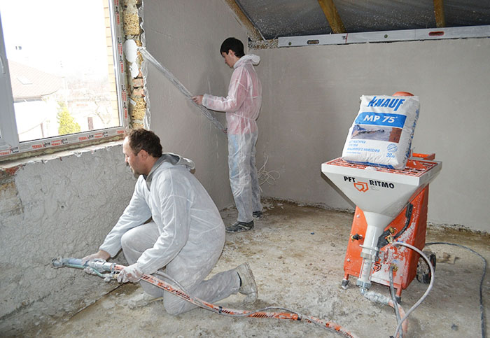 Сместа се приготвя предварително и се зарежда в машината, която след това я разпръсква равномерно върху стените или таваните. Това гарантира много по-бърза и качествена работа, особено при обработка на големи площи.